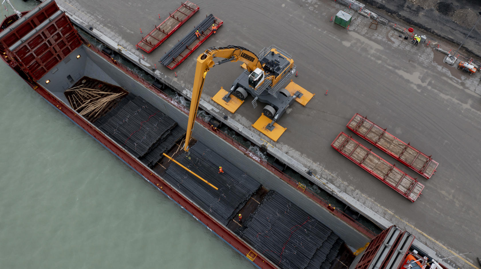 Støbningen af tunnelelementerne er i gang, og det kræver byggematerialer - og vi har netop haft besøg af endnu et skib med armeringsjern. Denne gang blev over 1.800 ton jern hentet op fra lastrummet og lagt på blokvogne på den vestre kaj i arbejdshavnen. Efter losning bliver jernet kørt videre over til armeringshalen, hvor jernet bukkes og klargøres til bygge tunnelelementets skelet. Jernskelettet er først step, inden støbningen kan finde sted.