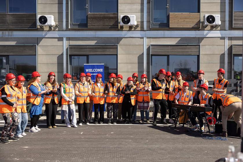 Opstarten på byggeriet af tunnelportalen blev markeret på byggepladsen med et arrangement for arbejderne med musikalsk indslag fra et kor fra Lolland Musikskole.