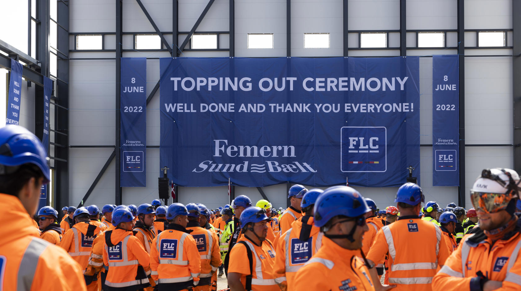 Onsdag den 8. juni 2022 kunne Femern A/S og hovedentreprenøren FLC fejre rejsegilde på Femern Bælt-tunnelens primære byggeplads ved Rødbyhavn på Lolland.