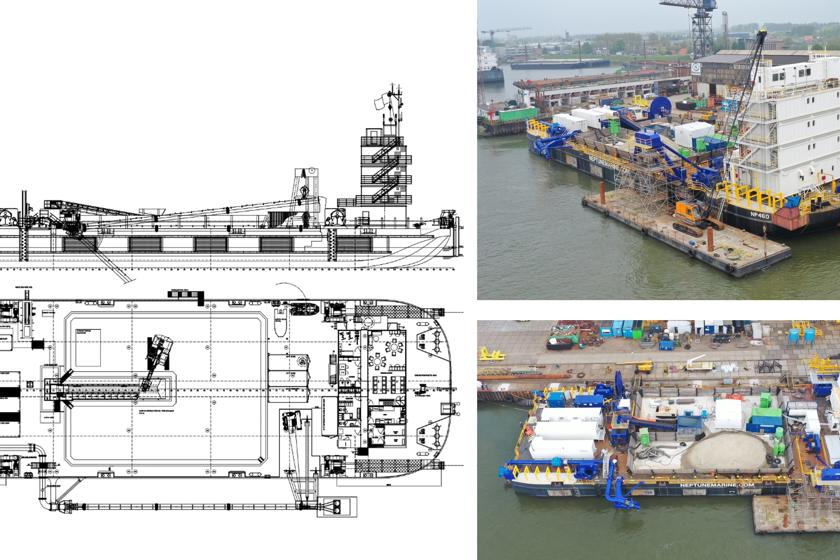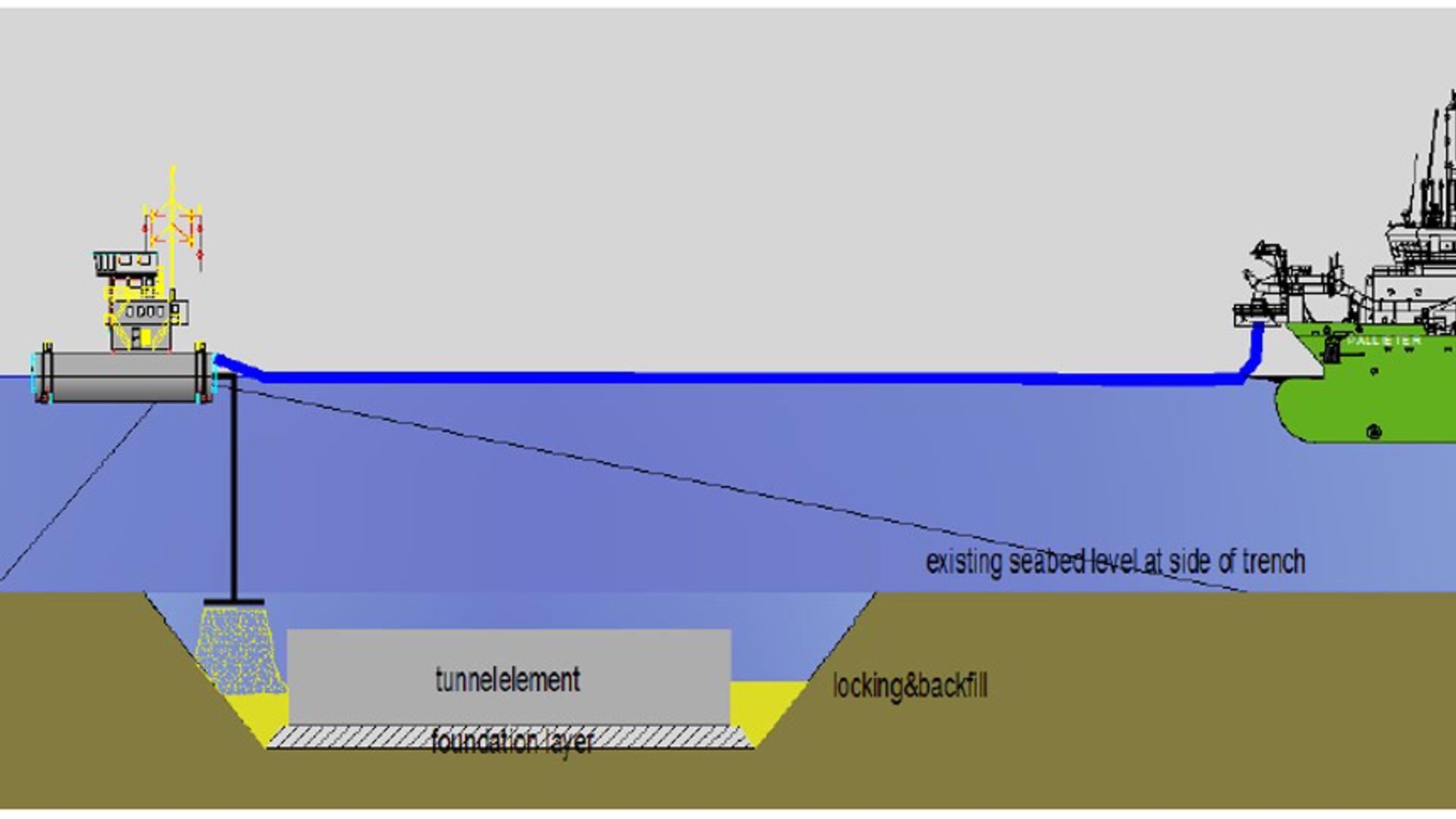 Det drejer sig om en såkaldt ”Spreader Pontoon”, der er et slags sejlende ’brusehoved’. Det specielle fartøj er 82,5 meter langt og 34,40 meter bredt. Det er udstyret med et langt rør med et særligt hoved for enden, der spreder sten og grus langs siderne af vores tunnelelement, når det er lagt på plads i tunnelrenden.