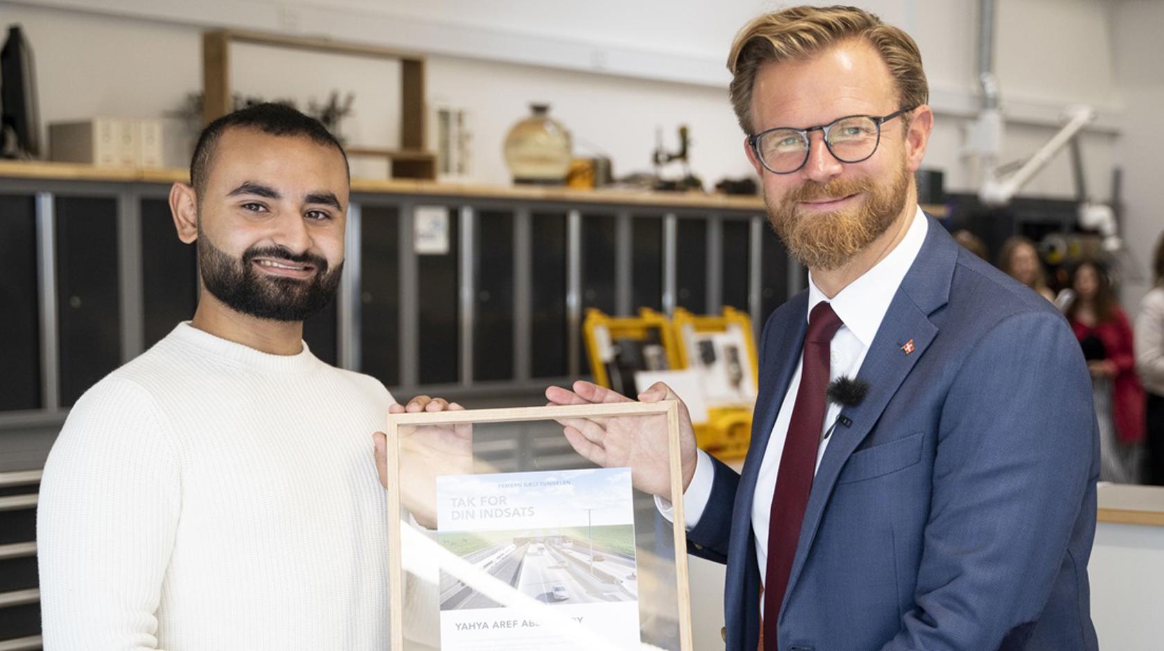 Under byggeriet af Femern Bælt-tunnelen vil der blive oprettet flere hundrede lærepladser over hele Danmark. Én af de første, der nu er blevet færdiguddannet på projektet er elektro-mekanikeren Yahya Abdelhady, som har arbejdet på de bøjer, som holder øje med havmiljøet i Femern Bælt. Transportminister Benny Engelbrecht ønsker ham tillykke med uddannelsen og håber, at rigtige mange unge vil følge i hans fodspor.