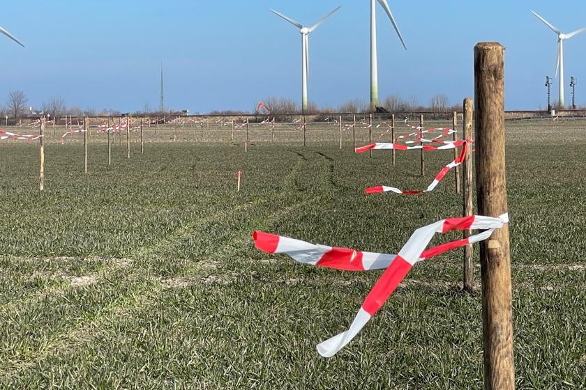 Arbejdet med frakørslen gik i gang i marts. Vejens forløb er afmærket med træpæle. For at sikre, at ynglende fugle ikke byggede rede på jorden i arbejdsområdet, er der blevet bundet lange flagrende plastikstrimler på pælene som en slags midlertidige fugleskræmsler.