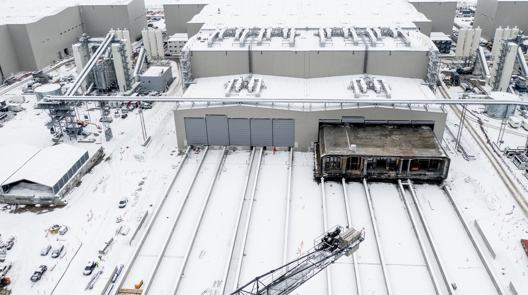 I produktionshal B har vores entreprenør haft travlt med støbearbejdet, og det første tunnelelement er nu blevet så stort, at det ikke længere kan være inde i fabrikkens Hal B. Der skal i alt ni segmenter til at lave de 217 meter lange tunnelelementer. Efter hvert segment skubber vi elementet frem for at gøre plads til det næste segment i støbeformen. Efter fire segmenter og med et femte på vej, betyder det, at det første element nu stikker ud ad hallens udgang.