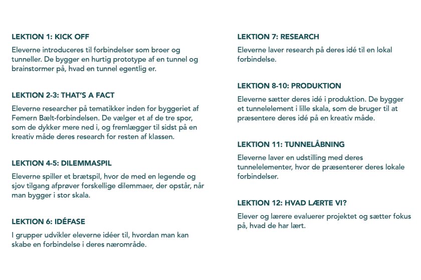 Klassen starter med at lære om Femern Bælt-tunnelen gennem spil og fælles aktiviteter. Her deler eleverne sig i grupper, hvor de vælger et af de tre temaer ’Byg smart’, ’Byg med drømmeholdet’ eller ’Byg med naturen’. Derefter skaber hver gruppe et projekt, som viser og undersøger, hvordan de kan skabe lokale forbindelser. Hver gruppe bygger et element til en fælles model af tunnelen, der viser deres idéer, og som klassen udstiller til slut.