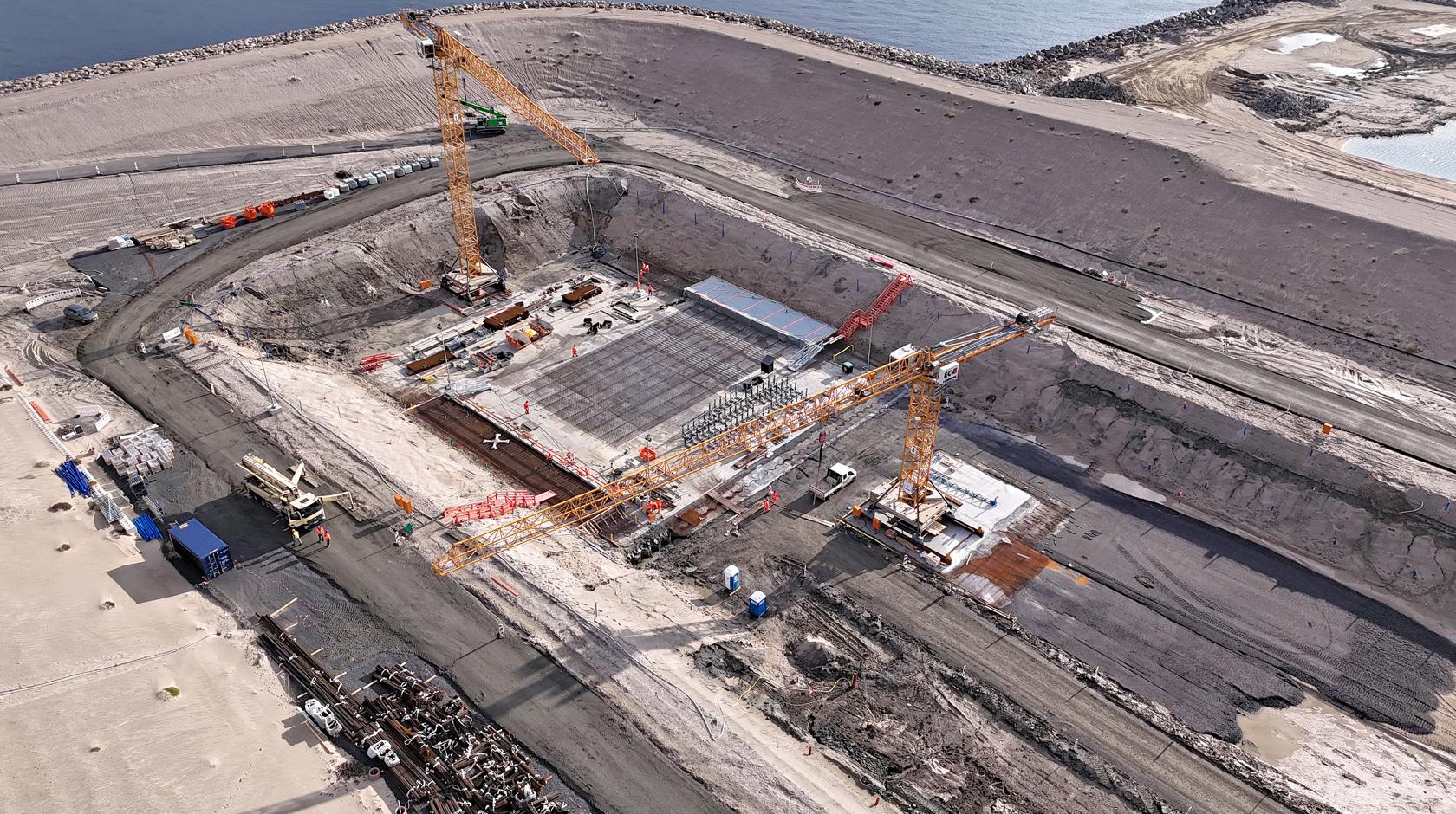 Der Beton, der sowohl für diese Arbeiten als auch für den Bau der drei Brücken auf der deutschen Baustelle verwendet wird, hat einen kurzen Weg: Er wird im Betonmischwerk direkt vor Ort hergestellt. Das dafür benötigte Material wird zum Großteil mit Frachtschiffen über den Arbeitshafen, der seit Juli 2023 in Betrieb ist, angeliefert. Auf diese Weise werden LKW-Transporte über die Insel Fehmarn vermieden.