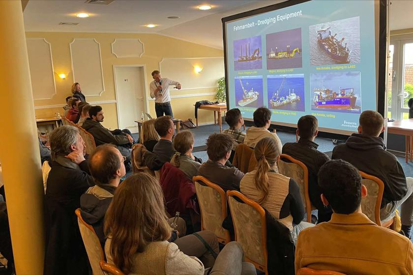 Experten und Expertinnen von Femern A/S und am Bau beteiligten Unternehmen erzählten in Vorträgen von ihrem jeweiligen Fachgebiet, über ihren eigenen beruflichen Werdegang und wie sie zum Projekt gekommen sind. Außerdem hatten die Studierenden die Gelegenheit, bei Bustouren über die deutsche Baustelle, den Stand der Arbeiten vor Ort zu sehen.
