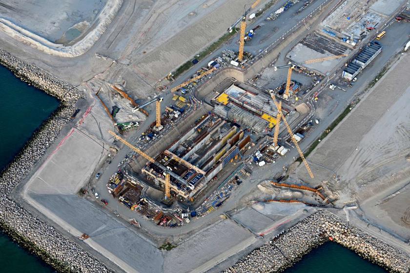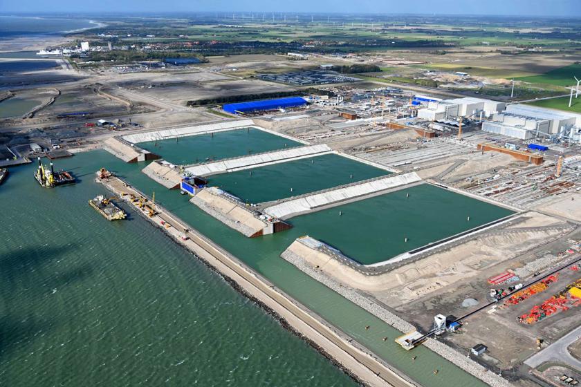 Der rund 50 Hektar große Arbeitshafen ist bereits seit Sommer 2022 in Betrieb. Über ihn werden – ebenso wie über das deutlich kleinere deutsche Pendent – Baumaterialien direkt zur Baustelle geliefert und somit das örtliche Straßennetz geschont. Östlich des Hafens wurden 2023 insgesamt vier Silos errichtet, in denen angelieferte Zuschlagstoffe wie Kies und Sand sowie Zement gelagert werden.