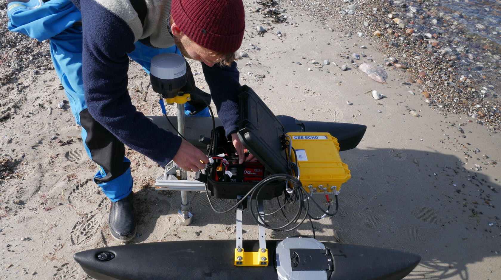 Als Teil dieses Monitorings fanden an der Küste Fehmarns nun Kartierungsarbeiten statt. Die Experten von DHI waren hierfür mit Schwimmdrohnen und weiteren GPS-gestützten Vermessungsgeräten im Einsatz. Die Schwimmdrohnen fuhren in festgelegten Bahnen – sogenannten Transekten – rund 900 Meter aufs Wasser hinaus. Ein Echolot ermittelte dabei entlang dieser alle 50 Meter verlaufenden Transekten den Abstand zum Meeresboden. Insgesamt wurden diese linienförmigen Messungen auf über 4 Kilometern Länge an der Nordostküste Fehmarns durchgeführt – von Puttgarden über Marienleuchte und Presen bis Höhe Klausdorf. Das Ufer selbst wurde mit einem weiteren GPS-Instrument vermessen, und auch eine Drohne überflog die gesamte Küstenlinie in diesem Bereich für Vermessungsarbeiten.
