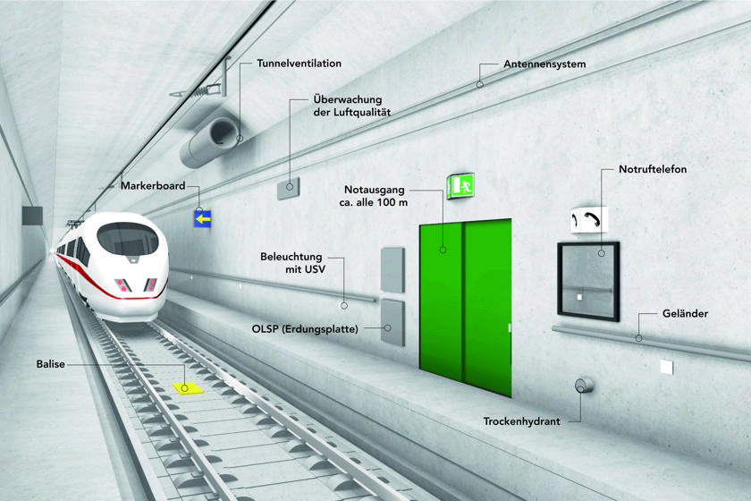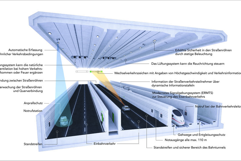 Ob im PKW oder im Zug ‒ die Tunnelnutzer werden die 18 km lange Verbindung als besonders sicher erleben. Im Tunnel sind sowohl der Straßen- als auch der Bahnverkehr in zwei separate Tunnelröhren getrennt, sodass es nie zu Gegenverkehr kommt. Auch die Bahnröhren sind so konzipiert, dass einem Entgleisen von Zügen entgegengewirkt wird.