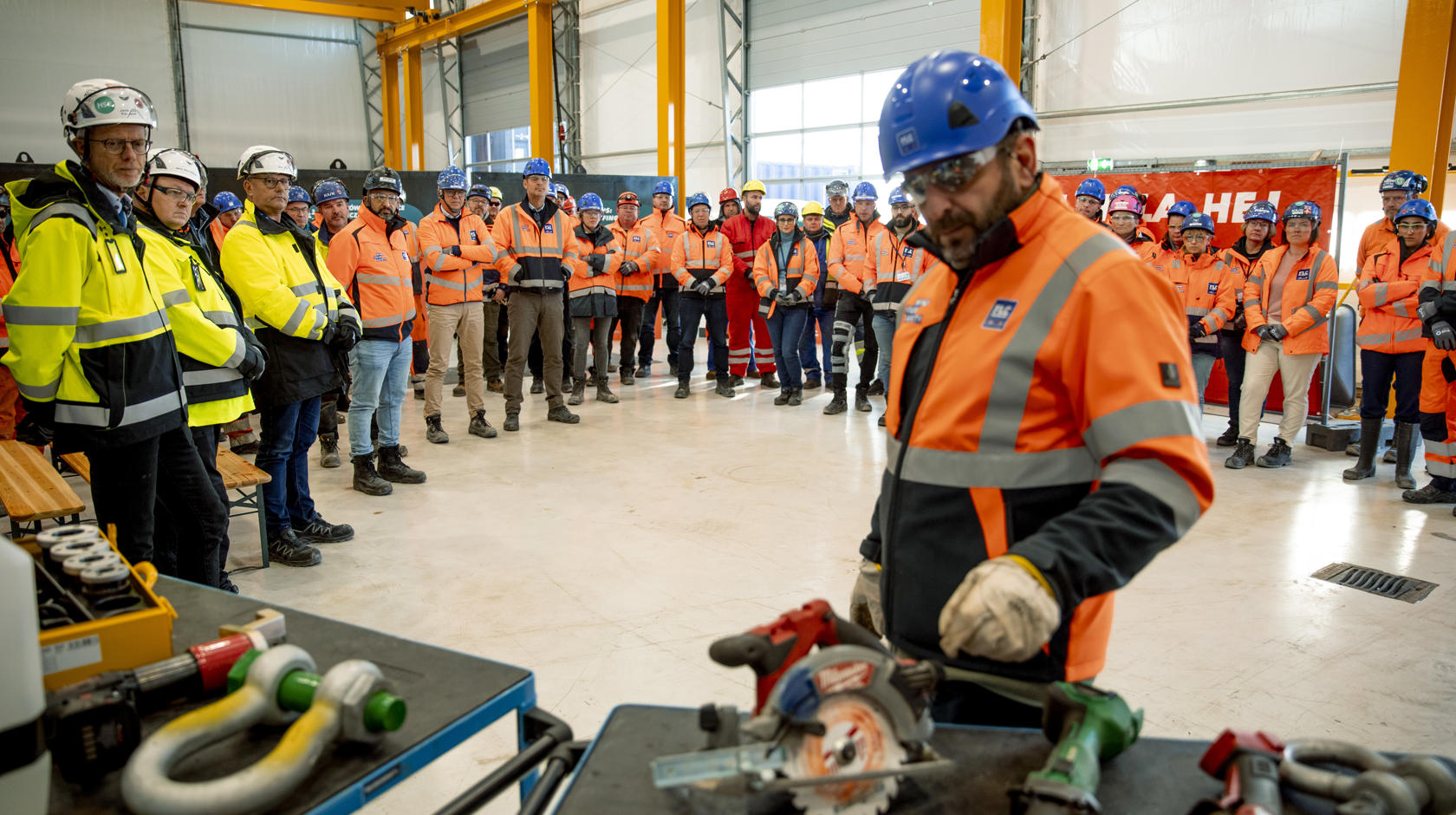 Around 75 workers from FLC plus members from FLC & Femern top management watched and listened as FLC HSWE manager, Geert Wouters, carried out a demonstration of various hand-held tools, safe ways of using them in the daily work and potential risks.