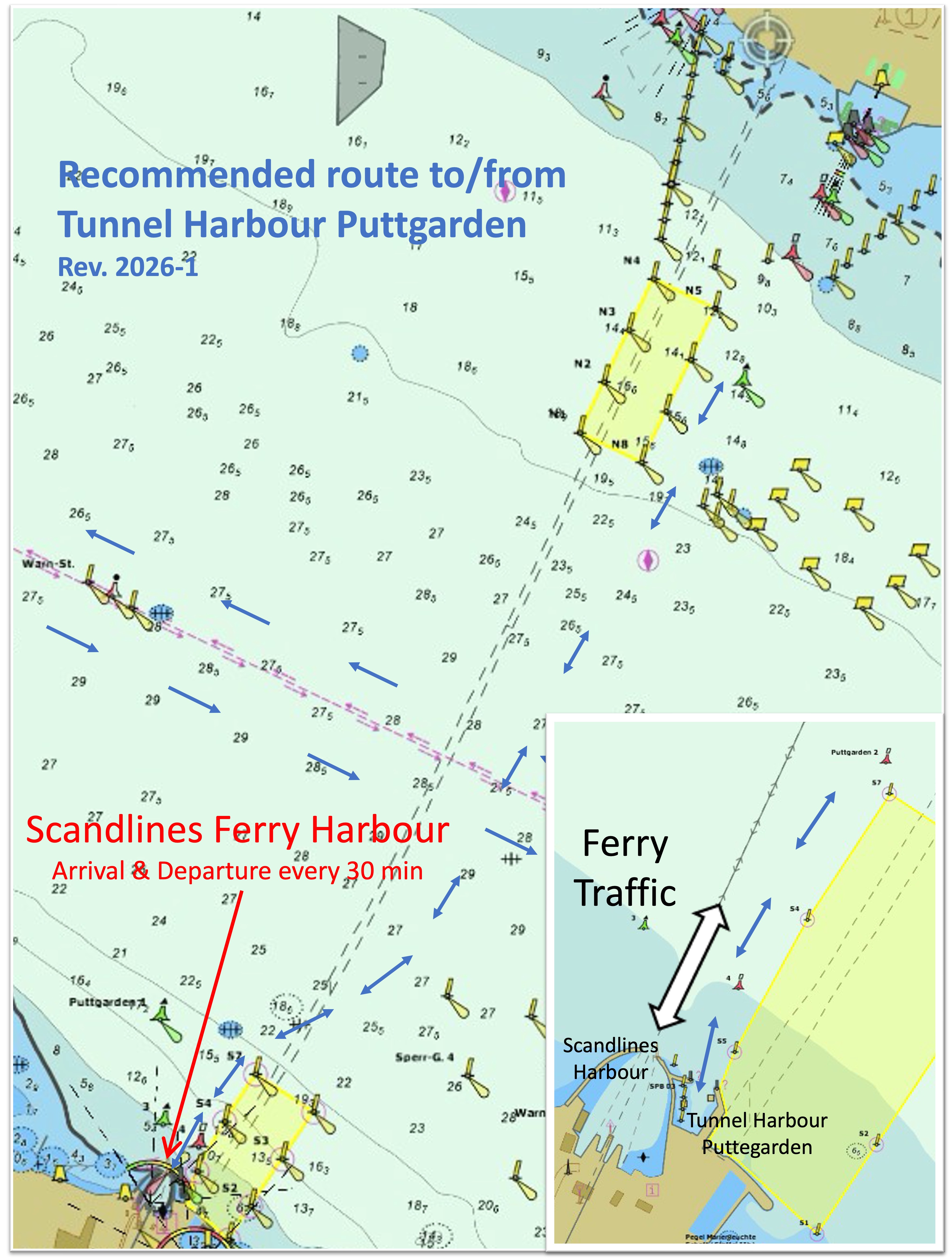 Recommended route for vessels approaching or departing Tunnel Harbour Puttgarden